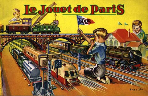 | En1935 JEP a édité un superbe catalogue couleur. On voit ici la couverture avec à gauche le grand autorail articulé, à droite la célèbre "Flèche d'Or" tandis que sur le pont passe une locomotive du type "Paris Orléans" | In1935 JEP printed an superb colour catalogue. Here is the cover with the big articulated railcar on the left hand side, the famous "Golden Arrow" on the right hand side while a locomotive of the "Paris Orléans" type runs on the bridge. |