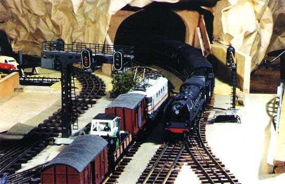 Un réseau, c'est toute une histoire... Celui-ci commence par être nomade, installé, chaque année, à même le sol, soit dans un grenier, soit dans le jardin, soit dans une grande pièce inoccupée dans la maison de campagne (laquelle surplombe d'une trentaine de mètres la voie impériale P.L.M.). construire à sa fantaisie un réseau chaque année pendant les vacances c'est passionnant, mais cela prend du temps, et les possibilités en sont limitées. C'est pour pouvoir être "exploité" réellement que le nomade s'est fixé définitivement dans un grenier de 6,50 m x 6,50 m en s"élevant à 90 cm du sol pour soulager les vertèbres des exploitants... lire la suite dans le bulletin du club. |
